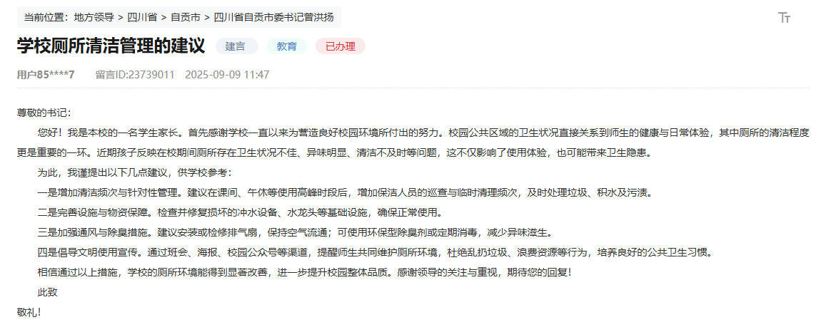 人民日报成都10月13日电(落雨)四川省自贡市家长近日在人民日报网上“领导公告栏”留言称,近期孩子反映学校厕所存在卫生不卫生、异味明显、清洁不到位等问题,不仅影响了使用体验,还给孩子带来了风险。健康。人民网“领导人留言板”网友留言截图。为此,网友提出了四点建议。第一步是增加清洁频率和使用针对性管理。为确保垃圾、积水、污垢及时清除,建议保洁人员增加巡查频次,并在休息、午休等使用高峰时段进行临时保洁。二是完善设施和物资保障。检查并修复损坏的冲水装置、水龙头和其他基础设施,以重新修复将它们调整到正确的工作状态。三是加强通风除臭措施。我们建议安装或修理排气扇以保持空气流通。您可以使用环保除臭剂或定期消毒来减少异味的出现。四是坚持文明使用、公益品格。通过班会、海报、校园官方账号等渠道,提醒师生共同维护卫生间环境,杜绝乱扔垃圾、浪费资源等行为,养成良好的公共卫生习惯。人民网“领导人公告栏”官方回应截图。针对留言建议,自贡高新技术产业开发区管委会社会工作办公室回应称,学校采取了四项措施进行改进。一是要求房地产公司保洁人员优化卫生间清洁加大休息、午休等使用高峰期后的检查和临时保洁频次,重点处理垃圾、水和污垢,确保高峰使用后厕所能迅速恢复清洁状态。同时,加强对保洁人员的后续监管,将保洁责任落实到每个人。二是加大对学校卫生间水龙头、冲水设备的检查频次,发现问题立即修复或更换。未来,将进一步完善日常报修机制,确保设备损坏及时发现并修复。第三,所有卫生间区域应更换。检查空气设备,修理和更换故障风扇,并保持最大的空气流通。另外,在保证师生安全的前提下,我们会使用经过环保认证的清洁消毒产品。真心友好,根据他们的实际可操作性,我们会定期开展针对性的工作,减少异味的出现,创造更清新的使用环境。四是学校通过早会、班会、学校公告、布告栏等形式,在日常运作中加强对学生的公共关系教育。我们将继续加强公共关系活动,积极引导师生尊重公共卫生设施,自觉遵守使用规则,维护校园清洁舒适的环境。