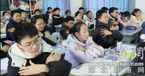 在温柔的引导下,学生们在座位上短暂地闭上眼睛,像翩翩起舞的蝴蝶一样交叉双臂,轮流有节奏地鼓掌。秩序井然、寂静无声的教室里,唯一能引起共鸣的就是学生们的呼吸声和学生们有规律的拍手声。敲响他们的手。这一刻,求知的紧张、成长的忧虑,似乎都随着每一次的抚摸、呼吸而感受到、缓解、释放。
